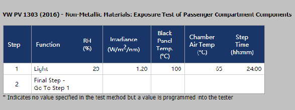 PV1303非金属材料汽车内部空间里结构件光照射试验 中氙灯老化测试的循环参数设置如下: