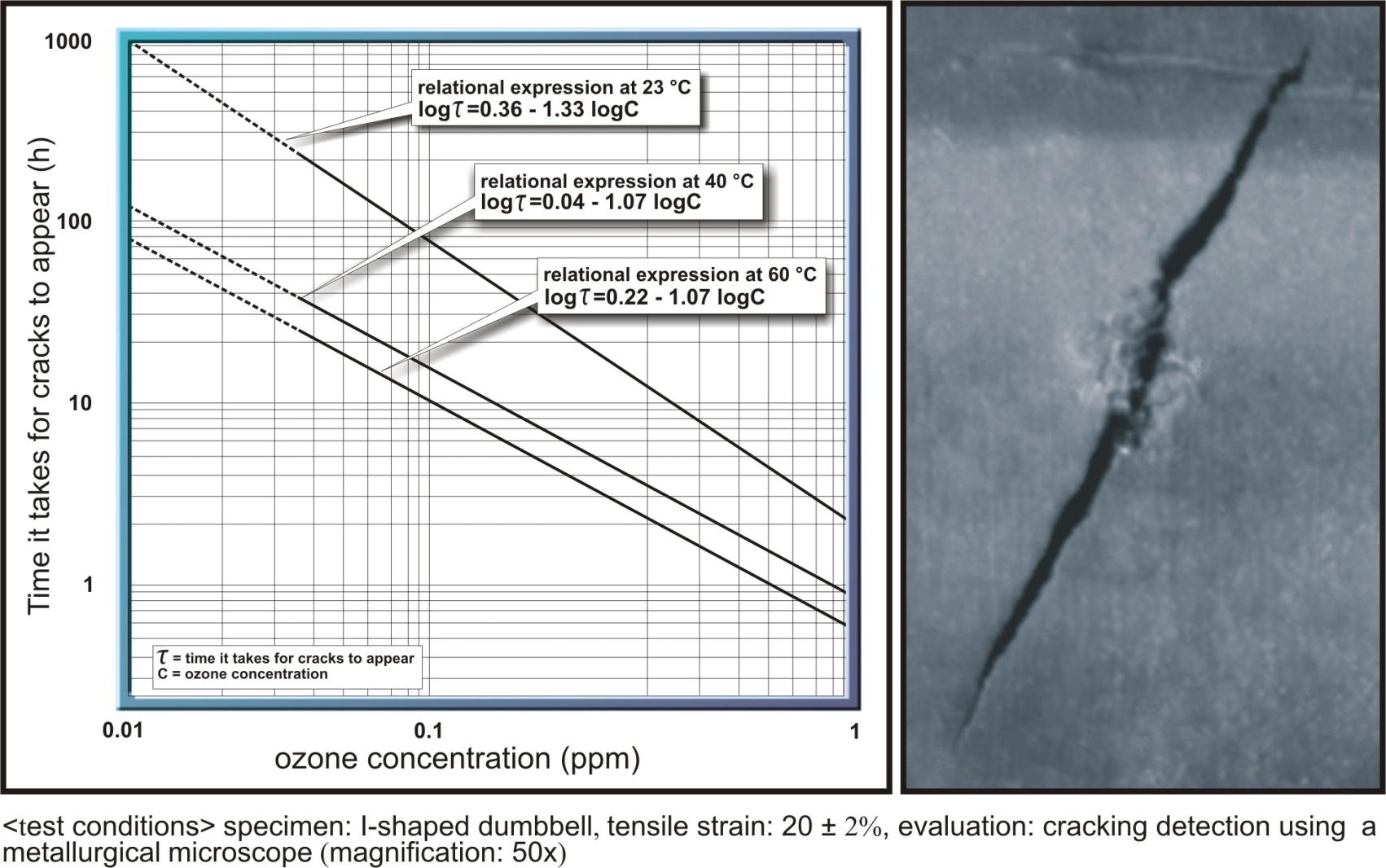 下图可以说明,臭氧浓度随着浓度增大,橡胶的耐臭氧老化时间减少。臭氧浓度的漂移就是臭氧浓度的变化会影响臭氧老化测试结果的准确性和数据的真实性。