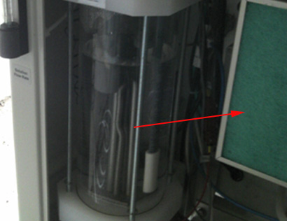 鼓风机失灵;如下图打开防尘网观察鼓风机是否转动。