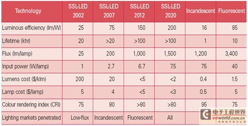 虽然在2003年时,LED亮度效能未能达到主照明的需求(表1),但已逐渐让世界注意到LED的未来性及对传统光源的威胁性。