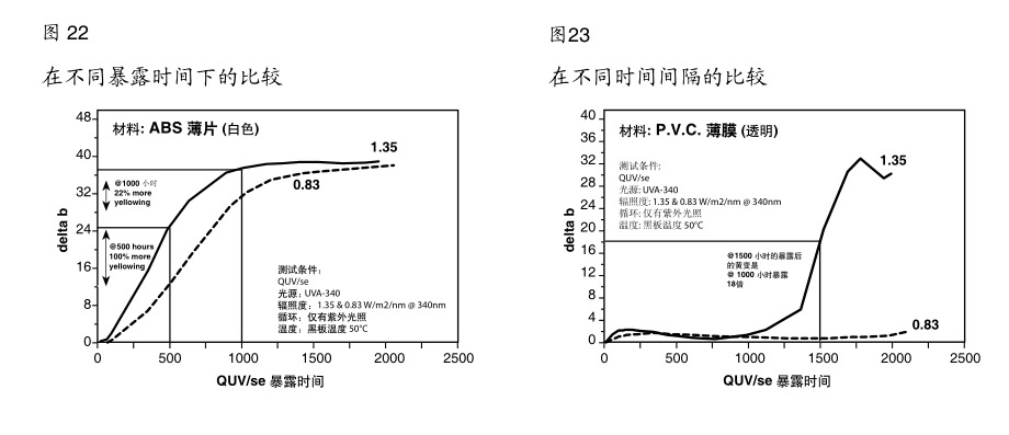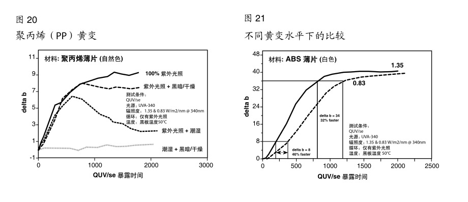 图21显示了以预期降解水平(在本例中,是发生黄变)进行暴露试验会引起混淆。如果在delta b的值达到8后终止暴露,较高辐照度的暴露将会加快48%。如果在delta b的值达到34后终止暴露,较高辐照度将只加快32%。只有进行该试验直到材料完全失效,才能完整地确定两个暴露之间的关系。